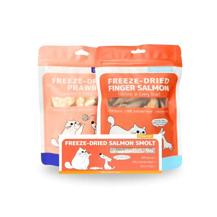 Discover the ultimate in pet nutrition with our Seafood Collection of premium freeze-dried dog and cat food. Featuring freeze-dried finger salmon, freeze-dried salmon smolt, and freeze-dried prawns, each treat is crafted to provide optimal health benefits for your furry friends. Rich in Omega-3 and Omega-6 fatty acids, high-quality proteins, and essential vitamins, these delicious and nutritious treats promote shiny coats, improved brain function, muscle growth, and overall vitality. Perfectly sized for easy feeding, our seafood treats are a delectable and healthy choice for both dogs and cats.